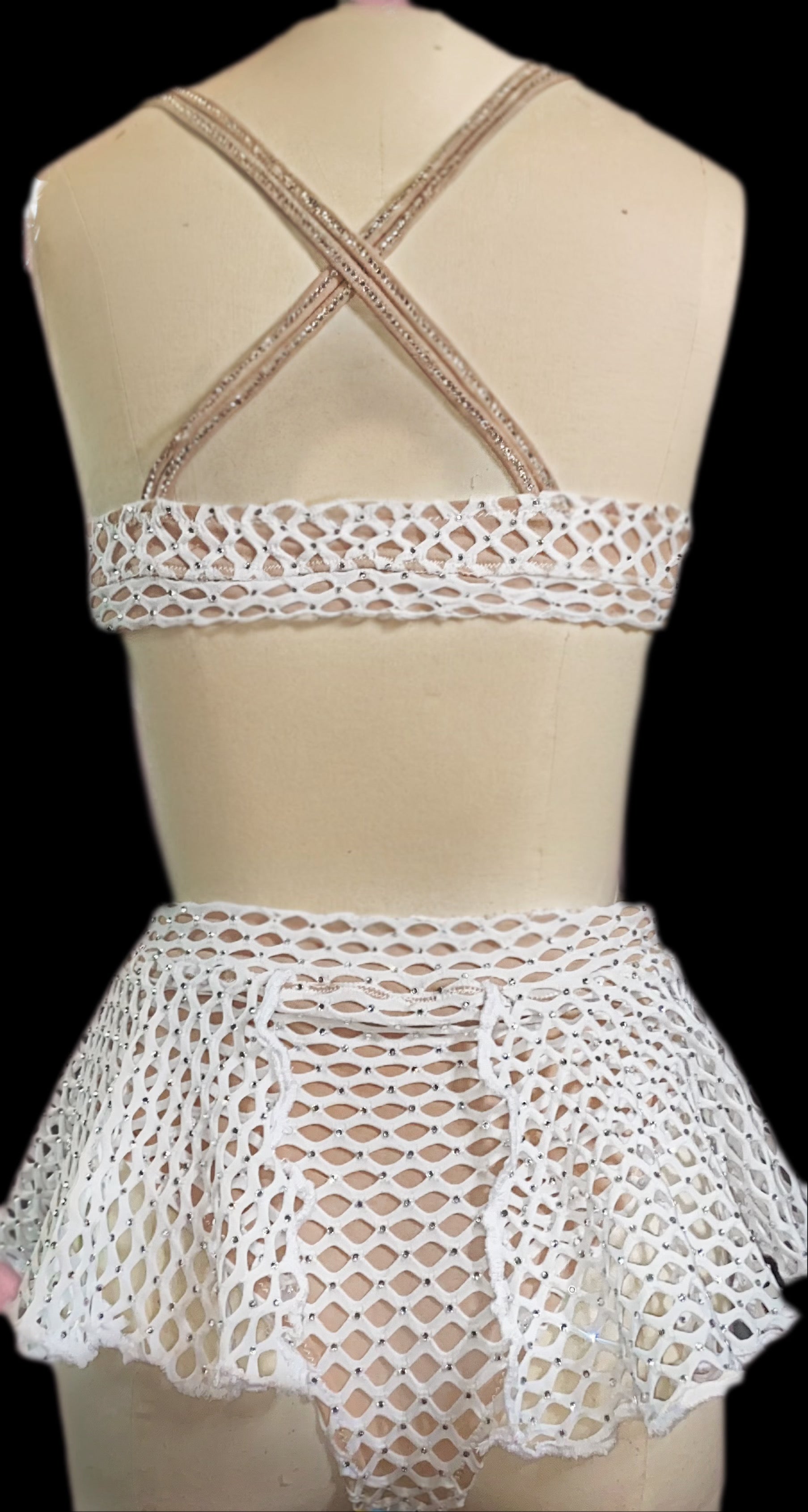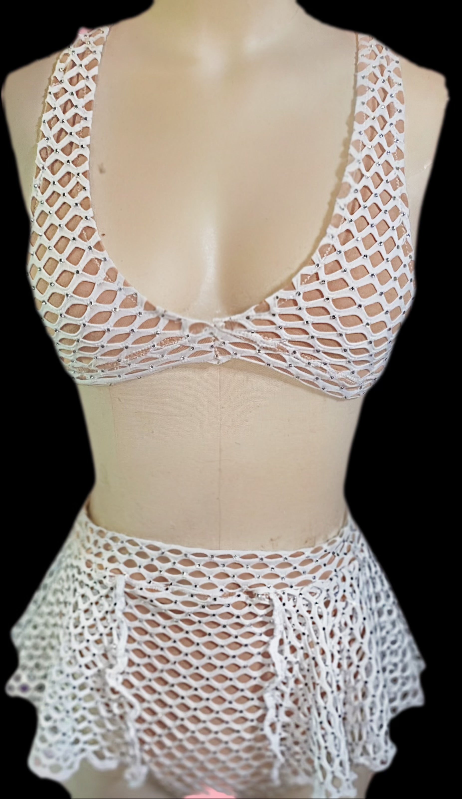 Shine like the queen you are. This head-turning two-piece features nude fabric beneath sparkling white fishnet, fully embellished for maximum glam. Every angle catches the light, making you the center of attention wherever you go. Perfect for the baddie who loves to slay, shine, and command every room. Limited edition, unapologetically fierce.