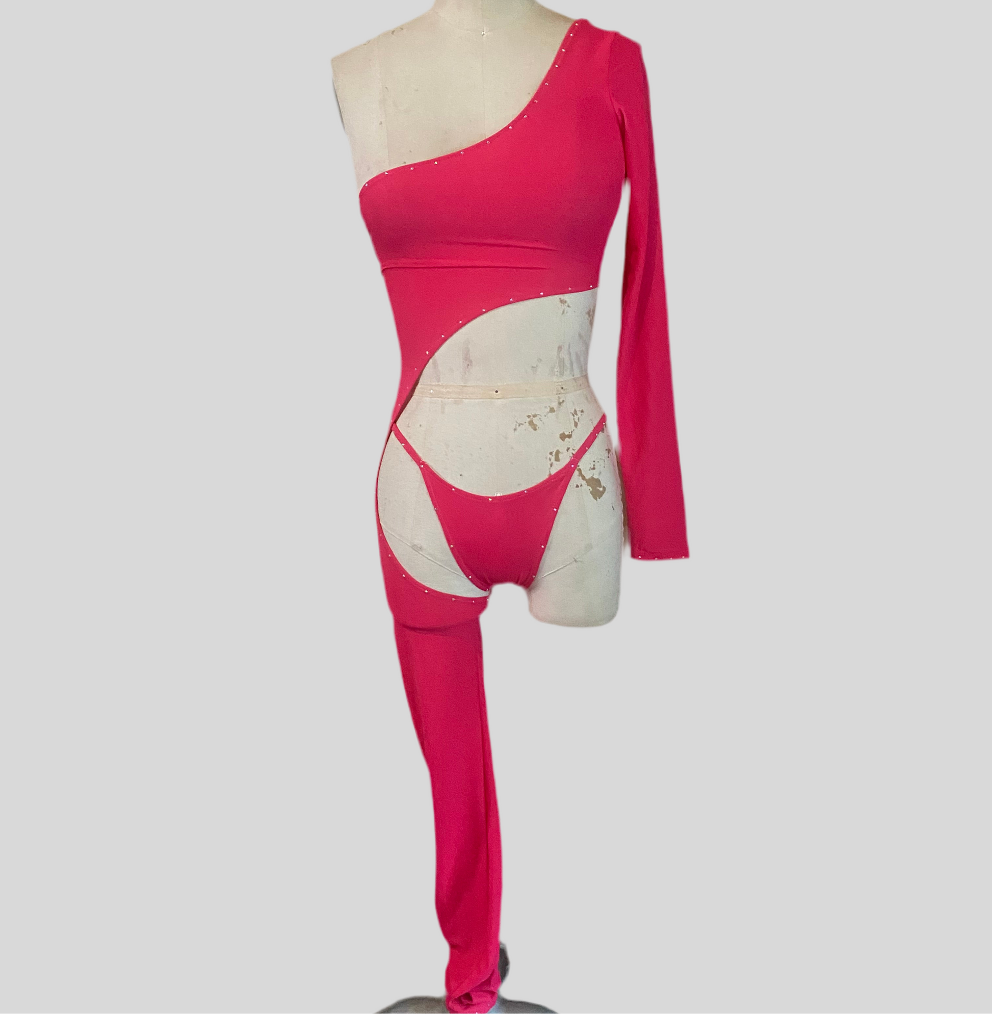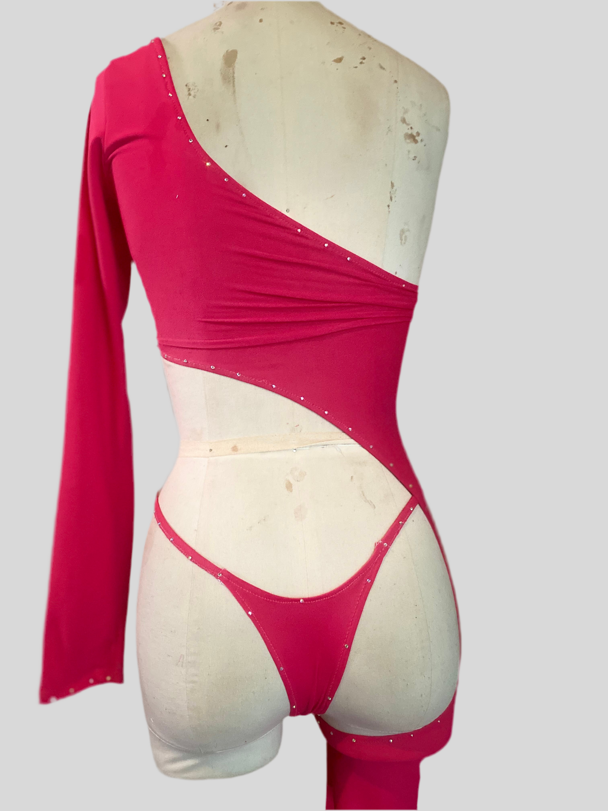 Command attention in this fierce, edgy look. The one-leg design sculpts your curves while the thong back keeps it flirty and bold. Soft, matted hot pink spandex gives a luxe, velvety finish that’s perfect for the unapologetic baddie and designed to turn heads.